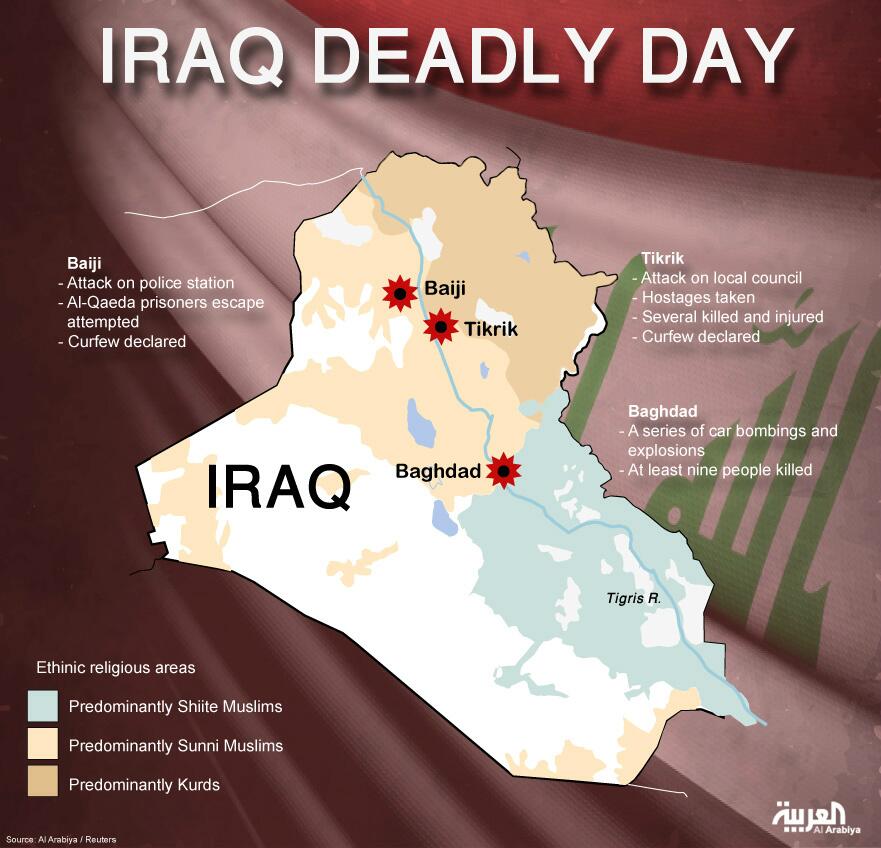 Infografik Al Arabiyya, serangan Mujahidin ISIS di beberapa lokasi sekaligus pada Senin (16/12/2013). Target berada di wilayah mayoritas Syiah.